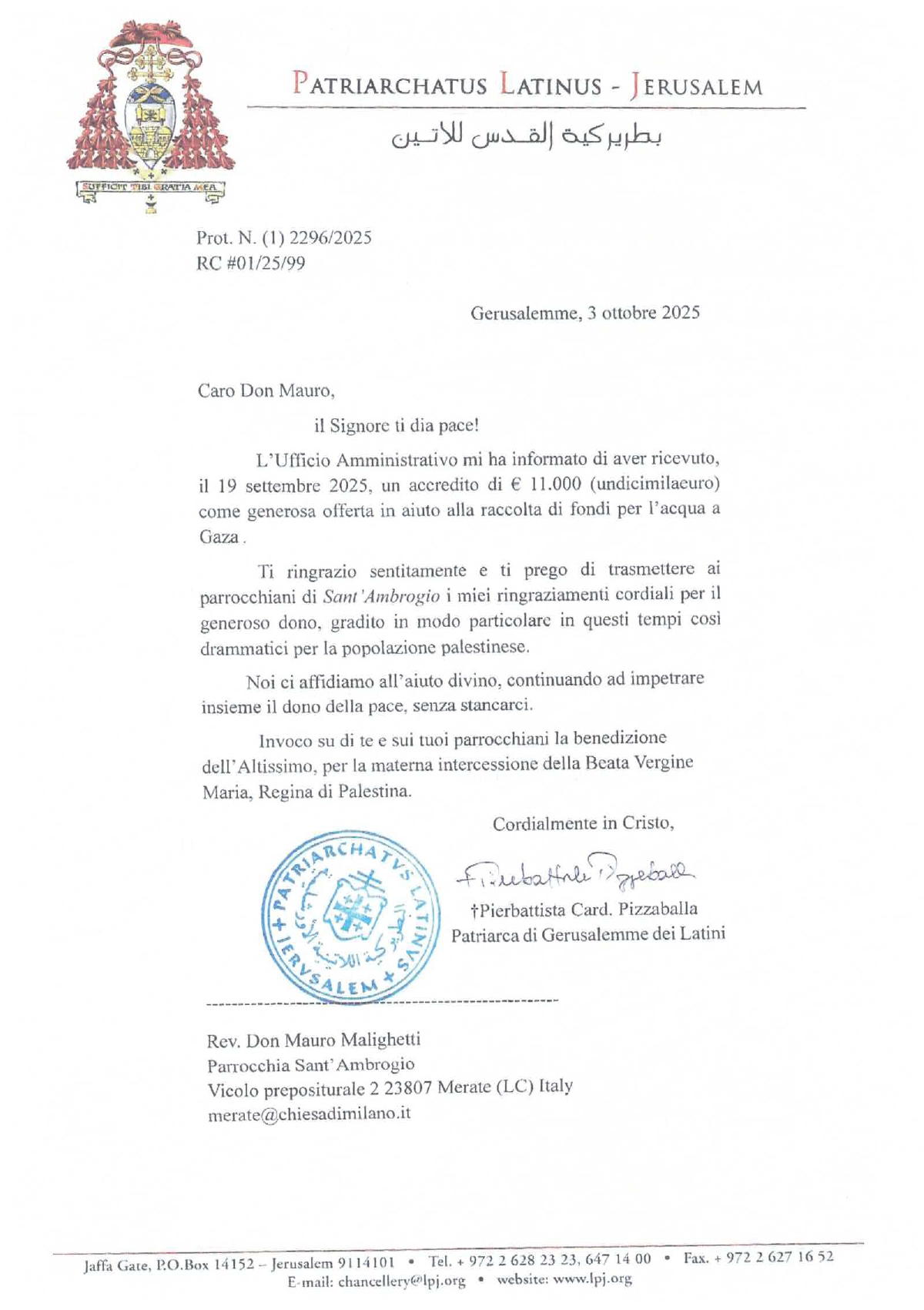 «Ti ringrazio sentitamente e ti prego di trasmettere ai parrocchiani di Sant’Ambrogio i miei ringraziamenti cordiali per il generoso dono, gradito in modo particolare in questi tempi così drammatici per la popolazione palestinese» ha scritto Pizzaballa in una lettera indirizzata al prevosto meratese, datata 3 ottobre 2025.