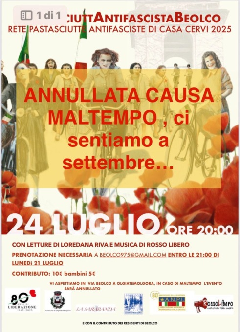 Il maltempo colpisce ancora: annullata la Pastasciutta Antifascista del BeolcoFest. Niente da fare per l’evento Pastasciutta Antifascista in programma per stasera, giovedì 24 luglio 2025, al BeolcoFest di di Olgiate Molgora, annullato a causa del maltempo.