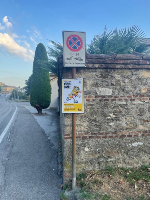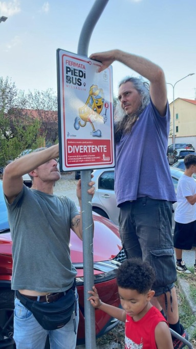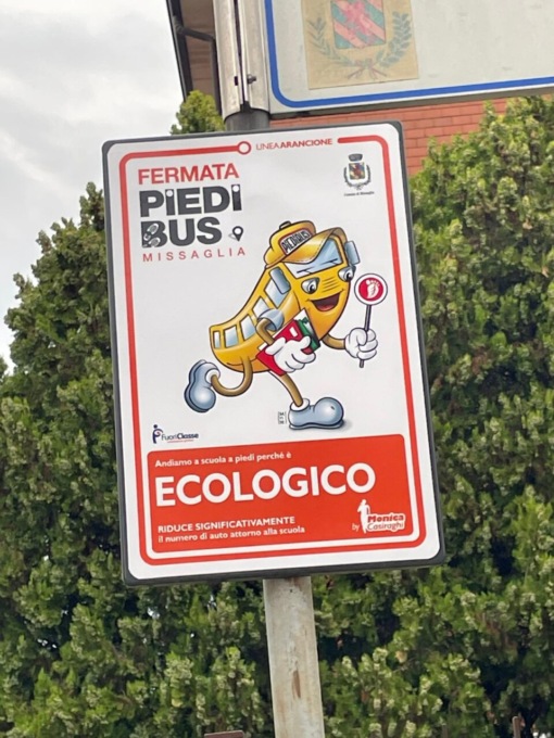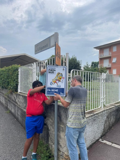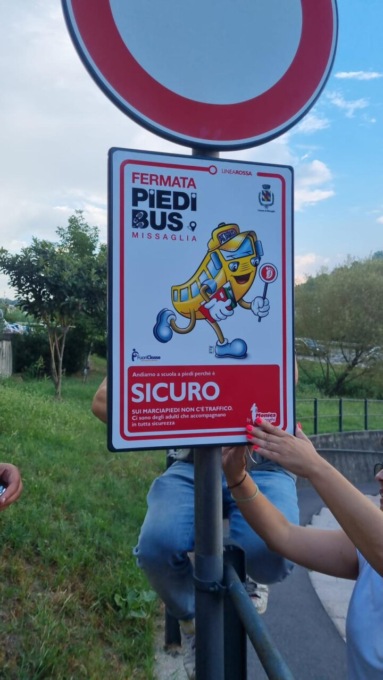 I volontari hanno installato i cartelli sulle linee del piedibus, 3 a Missaglia e 2 a Maresso, con il disegno della nuova mascotte creata da Davide Perego con l’aiuto della grafica Mara Girardi, un pullman con i piedi, e dei messaggi motivazionali con cui i volontari hanno voluto sottolineare l’importanza del piedibus a livello ecologico, di salute e sociale.