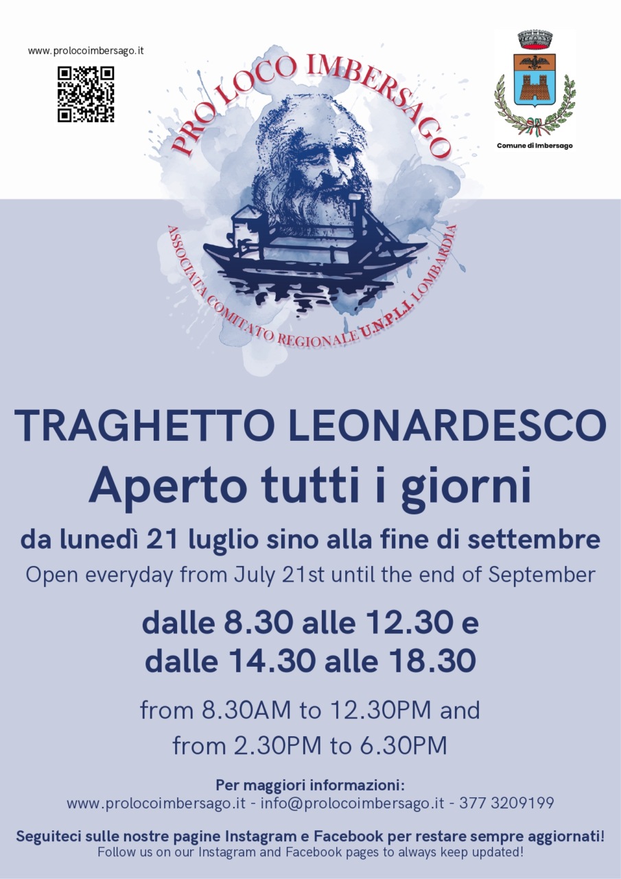 A partire da lunedì 21 luglio 2025, il traghetto leonardesco sarà in funzione tutti i giorni grazie al prezioso contributo dei volontari della Pro Loco di Imbersago.