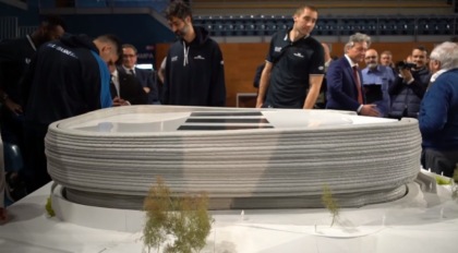 Il palazzetto è stato svelato alla cittadinanza e alle autorità locali e regionali grazie al prototipo in stampa 3D prodotto con la collaborazione di tecnici e ricercatori di Italcementi. Un modellino in scala (2 metri x 2 metri per 450 kg di peso) realizzato con lo stesso materiale con cui sarà costruito il palazzetto: il calcestruzzo.
