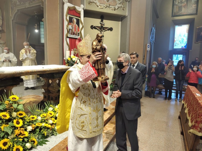 Il santuario della Madonna del Bosco di Imbersago ha accolto l’arcivescovo Mario Delpini: ieri, venerdì 28 ottobre alle 16, in moltissimi si sono riuniti per partecipare alla Santa Messa celebrata in occasione del 60esimo anniversario della costruzione della statua dedicata a Papa Giovanni XXIII. A fine celebrazione i fedeli hanno anche donato all’arcivescovo una statuetta in bronzo del Papa, come segno tangibile e ricordo della sua visita in paese.