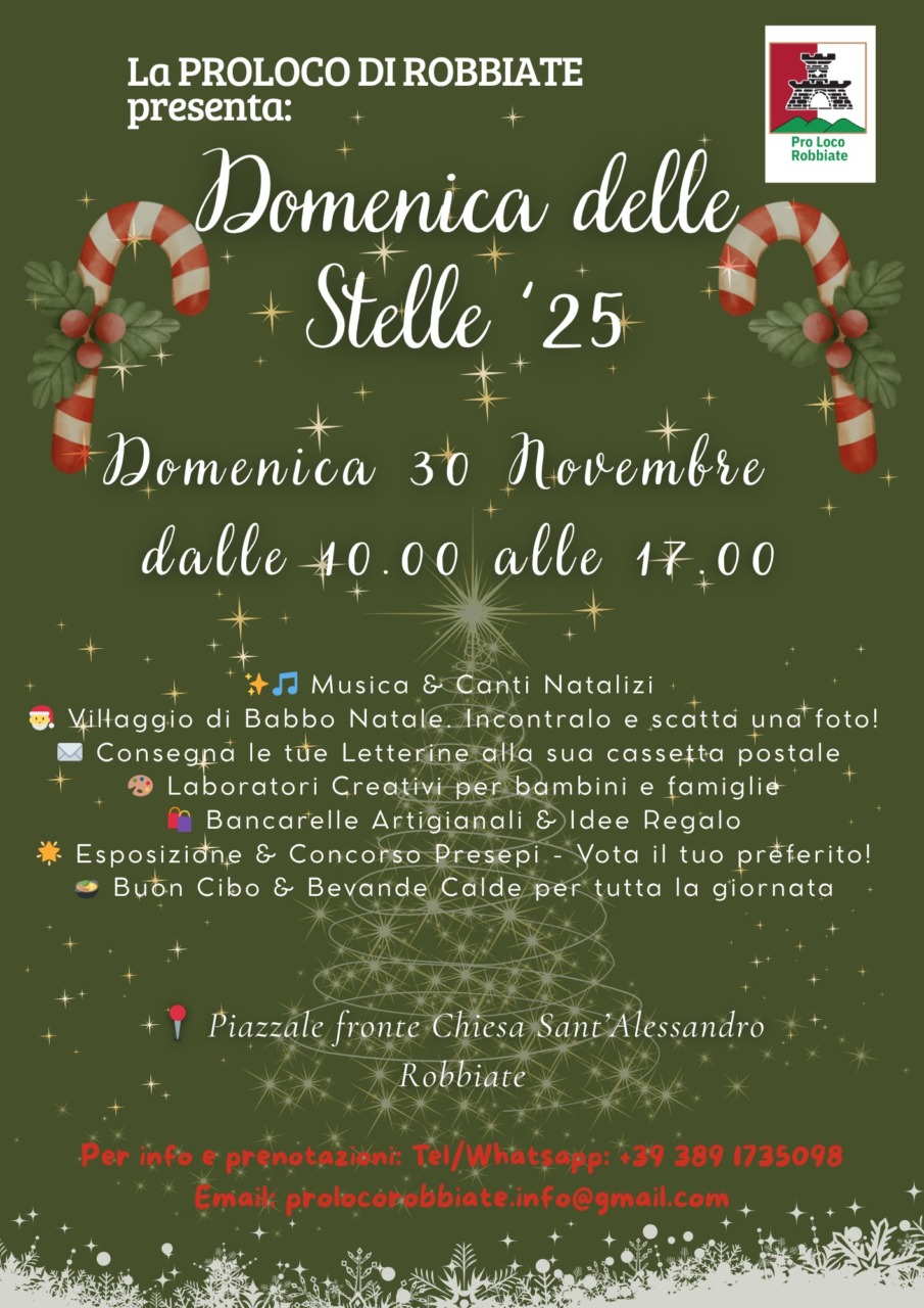 La Pro Loco di Robbiate cerca hobbisti, artigiani e commercianti per allestire la «Domenica delle stelle», in programma per domenica 30 novembre dalle 10 alle 17 nel piazzale difronte alla chiesa.