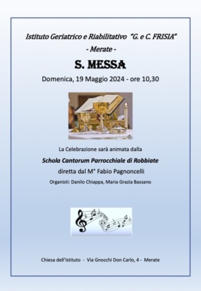 Domenica 19 maggio 2024 alle 10.30, nella Chiesa dell’Istituto Geriatrico e Riabilitativo “G. e C. Frisia” di Merate, verrà celebrata, da Don Biagio Fumagalli, la Santa Messa domenicale per gli Ospiti ed il Personale dell’Istituto.