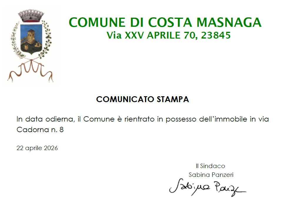 Con l’atto odierno, l’amministrazione guidata dal sindaco Sabina Panzeri riacquisisce formalmente l’immobile, chiudendo una lunga fase di confronto istituzionale e giudiziario. Resta ora da definire la nuova destinazione della struttura
