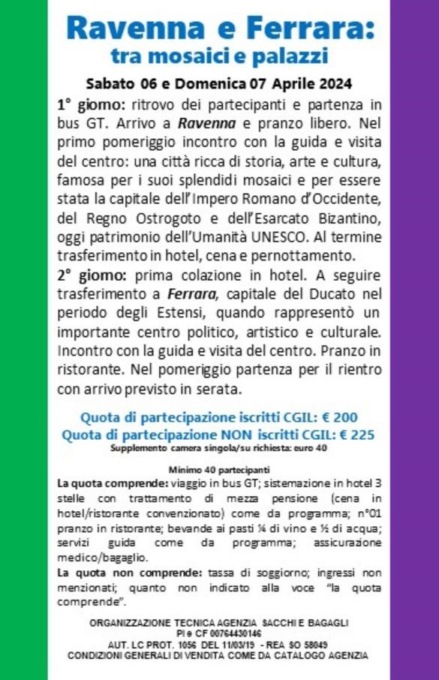 Il weekend del 6 e 7 aprile invece sarà dedicato alla conoscenza di due importanti centri romagnoli, Ravenna e Ferrara. Città ricche di storia, arte e cultura, famose la prima per gli splendidi mosaici bizantini, considerati tra i più belli e meglio conservati al mondo, la seconda per il suo straordinario centro storico e per l’imponente castello Estense, che rappresentava il cuore politico e culturale del ducato. Previsto il pernottamento in hotel, con una quota di 200 euro per gli scritti alla CGIL, 225 per i non iscritti.