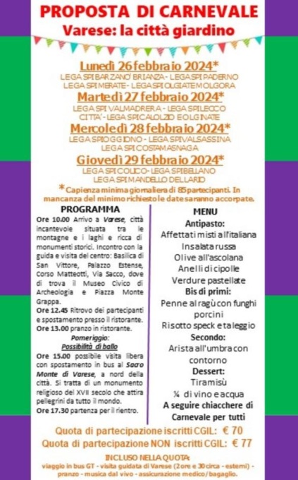 La prima è dedicata alla visita della città di Varese, detta anche “Città Giardino”, in una giornata il 26, 27, 28 e 29 febbraio, a seconda della lega di appartenenza. Oltre ad ammirare lo splendido scenario tra lago e montagne, si visiteranno i monumenti storici del centro, tra dimore signorili, edifici religiosi, fortificazioni e tesori dell’Unesco. Prevista una visita al Sacro Monte, un complesso di 14 cappelle votive che ripercorrono i misteri del Rosario e conducono a uno splendido Santuario. Come sempre è in programma un pranzo conviviale e la possibilità di ballo nel ristorante che accoglierà i partecipanti per il pranzo. La quota di partecipazione è di 70 euro per gli iscritti alla CGIL, 77 per i non iscritti.
