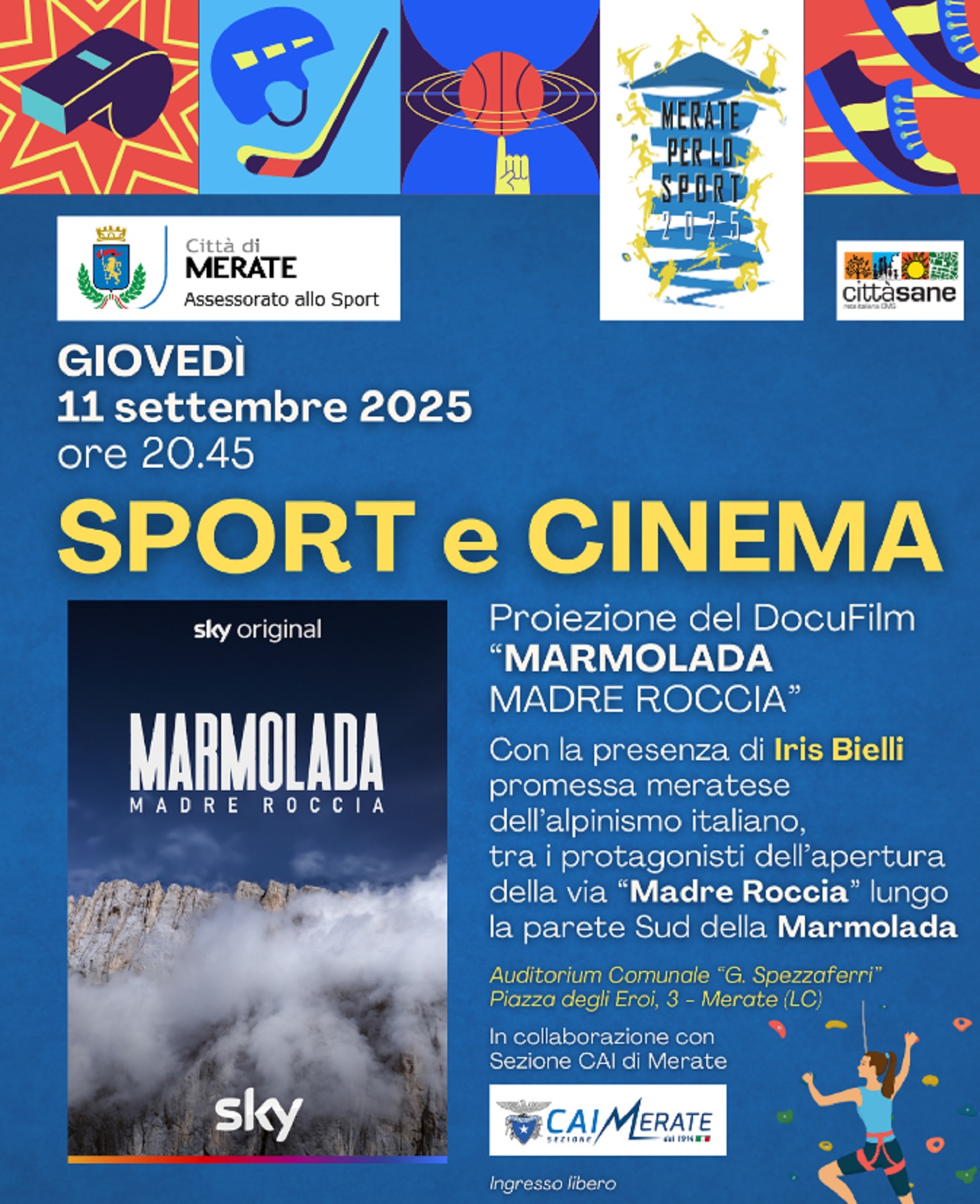 L’auditorium «Giusi Spezzaferri» ospiterà dalle 20.45 la proiezione del docufilm «Marmolada Madre Roccia» alla presenza di Iris Bielli, promessa meratese dell’alpinismo italiano, tra i protagonisti dell’apertura della via «Madre Roccia» lungo la parete sud della Marmolada.