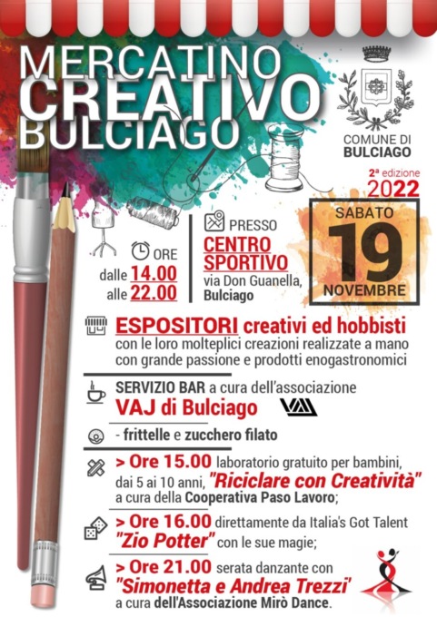 Gli stand di espositori creativi e hobbisti sono sati allestiti alle 14, con anche un servizio bar a cura dell’associazione Vaj di Bulciago e frittelle e zucchero filato per tutti. Alle 15 si è tenuto il laboratorio per bambini dai 5 ai 10 anni “Riciclare con creatività”, con la Cooperativa Paso Lavoro. Alle 16 è stato organizzato invece lo spettacolo di magia “Zio Potter” e per concludere la giornata, alle 21, si terrà la serata danzante con “Simonetta e Andrea Trezzi” con l’associazione Mirò Dance.