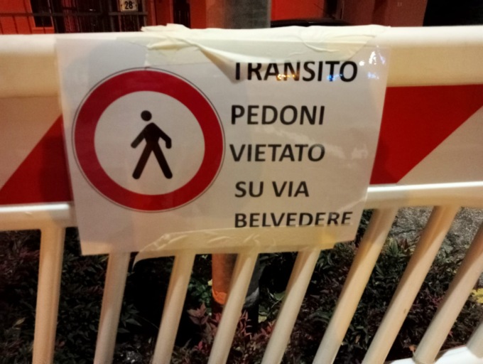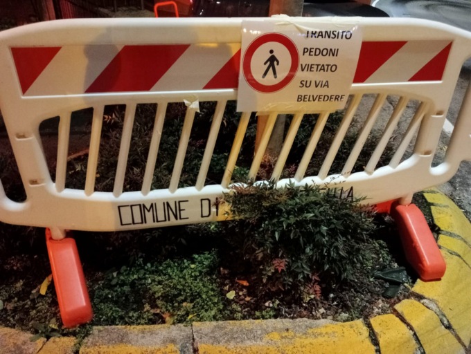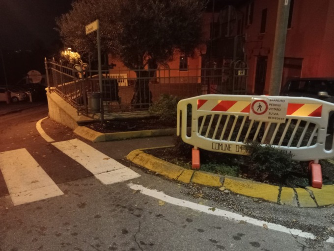 Nel pomeriggio di mercoledì 31 ottobre per far sì che l’ordinanza emessa dal sindaco Pendeggia venga rispettata, il Comune ha predisposto delle transenne in via Belvedere che impediscono ai pedoni di accedere al marciapiede.