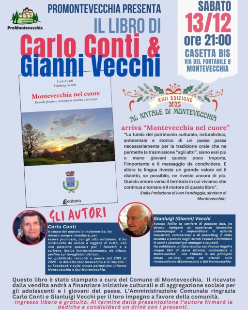 Verrà presentato stasera, sabato 13 dicembre, alle 21 in Casetta Bis, in occasione dei festeggiamenti comunitari in vista del Natale, il libro «Montevecchia nel cuore», scritto a quattro mano dai volontari Gianluigi Vecchi e Carlo Conti