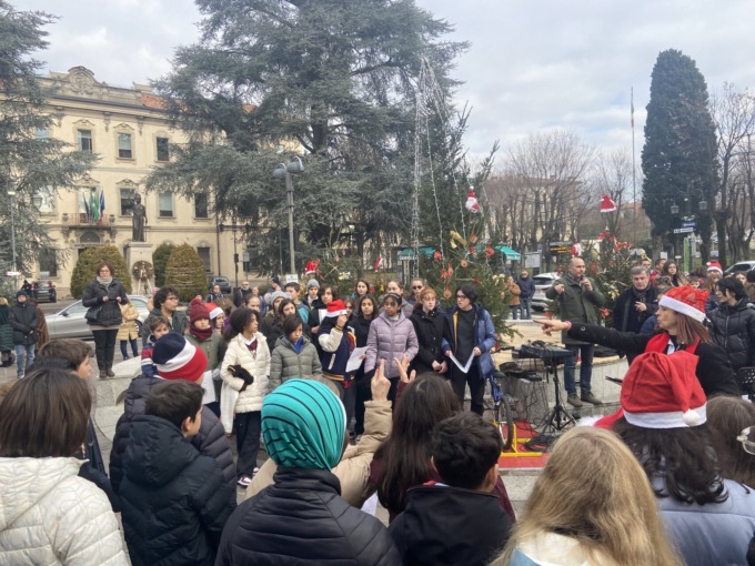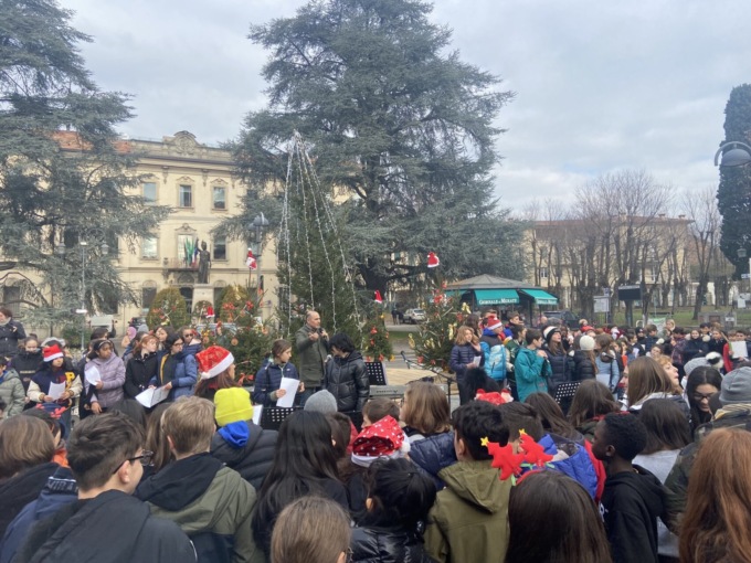 Un Natale di gioia ed emozione: la scuola secondaria di Merate festeggia in piazza raccontando una storia a tutti i passanti e cantando le celebri canzoni delle festività.