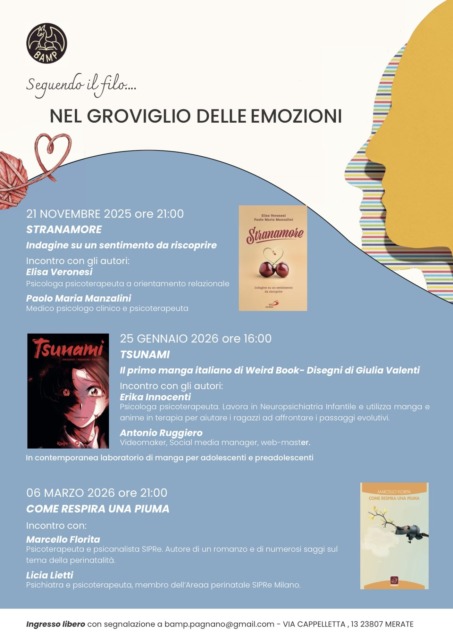Al via nella serata di oggi, venerdì 21 novembre, il ciclo di appuntamenti dal titolo “Nel groviglio delle emozioni”, organizzati dalla BAMP (Biblioteca Alfonso Mandelli Pagnano) a Merate.
