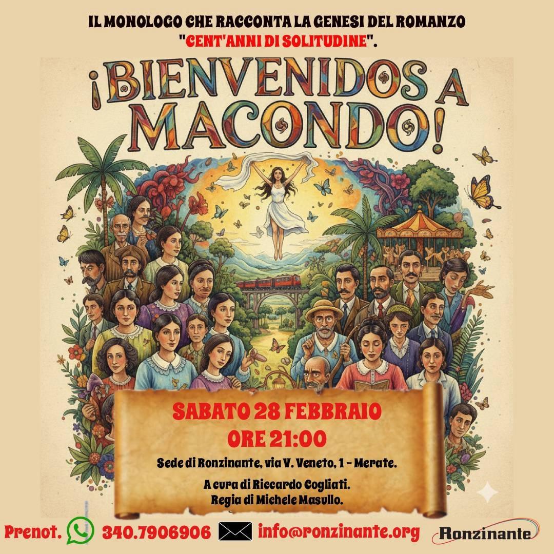 Si prosegue sabato 28 febbraio sempre alle 21 con un appuntamento tra letteratura e teatro: sarà Riccardo Cogliati, coadiuvato dalla regia di Michele Masullo, a portare in scena sul palco di Spazio50 “Bienvenidos a Macondo!”, un monologo dedicato alla nascita di uno dei romanzi più celebri del Novecento: Cent’anni di solitudine di Gabriel García Márquez.