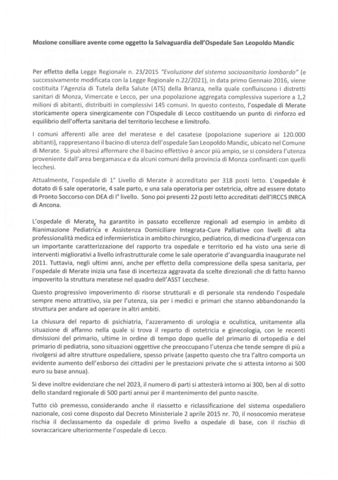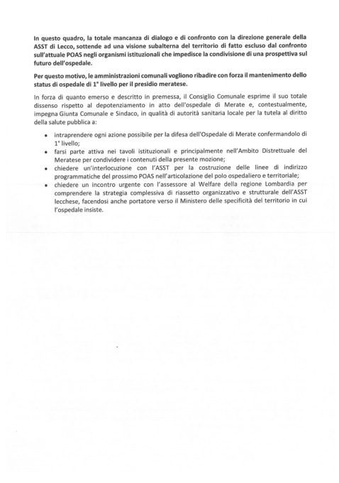 Quattro le richieste della mozione “partorita” dal tavolo di lavoro che ha riunito diverse forze politiche eccezion fatta per quelle di centro-destra (non vi ha partecipato nessun rappresentante di Lega, Fratelli d’Italia e Forza Italia) e che è già stata trasmessa a sindaci e capigruppo in modo da poterla discutere in tutti i Consigli comunali: intraprendere ogni azione possibile per confermare l’ospedale di Merate come presidio di primo livello; farsi parte attiva nei tavoli istituzionali per condividere i contenuti della mozione; chiedere un’interlocuzione con l’azienda ospedaliera per la costruzione delle linee di indirizzo del prossimo Poas (Piano di Organizzazione Aziendale Strategico); chiedere un incontro urgente con l’assessore al Welfare Guido Bertolaso.