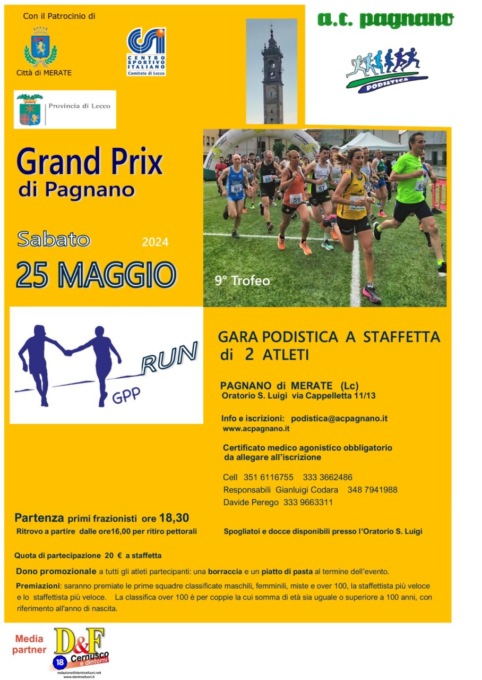 Manca meno di un mese al 9° Trofeo Grand Prix di Pagnano, la manifestazione podistica a staffetta che si disputerà sabato 25 maggio, con partenza e arrivo all’Oratorio di Pagnano.
