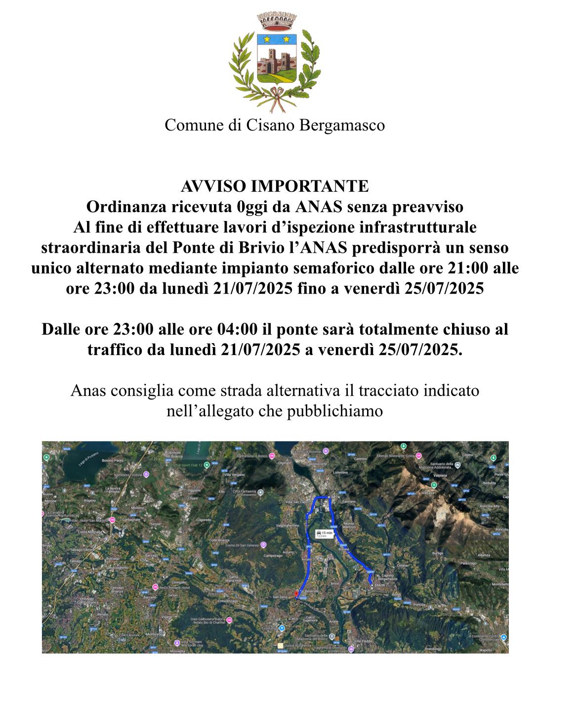 A imporre la chiusura per consentire ai tecnici dell’azienda di Trieste incaricata di svolgere l’ispezione è stata Anas, che ha inoltrato ai Comuni di Brivio e Cisano Bergamasco un’ordinanza nella giornata di ieri, martedì 15 luglio 2025.