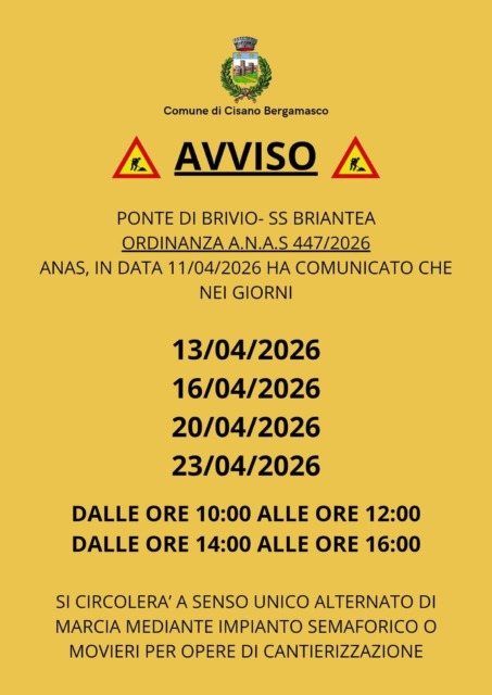 E’ di oggi la comunicazione dell’imposizione del senso unico alternato sul viadotto che collega Brivio e Cisano in diversi momenti dei prossimi giorni per consentire le opere di cantierizzazione.
