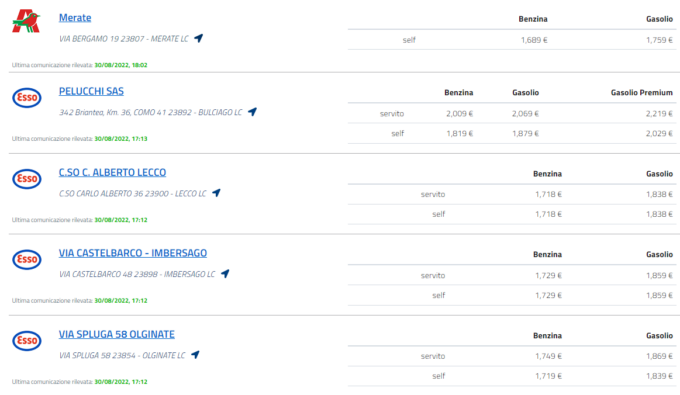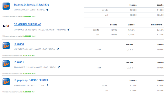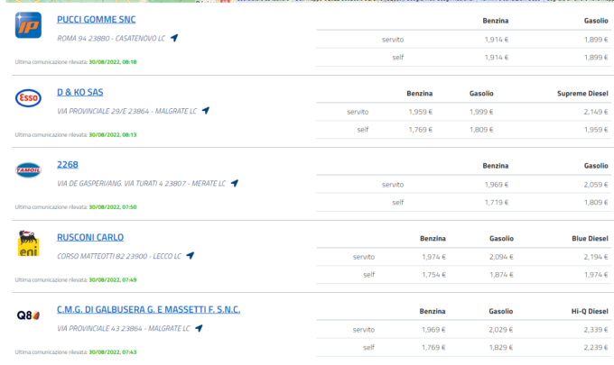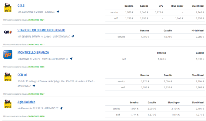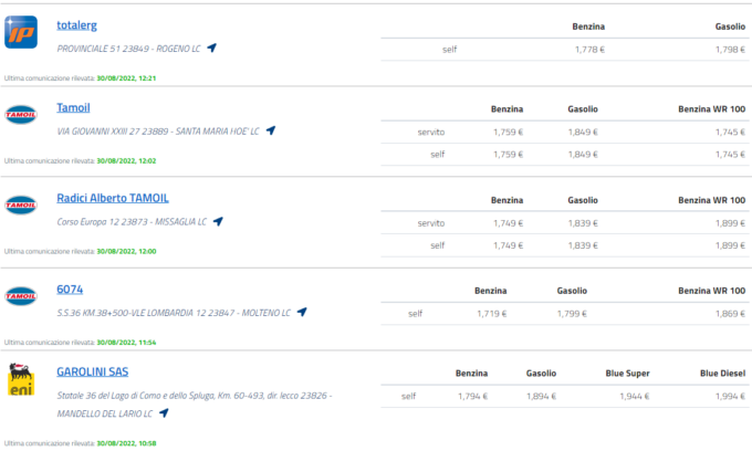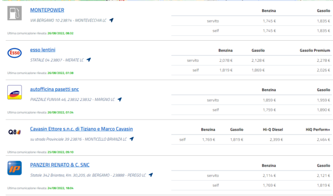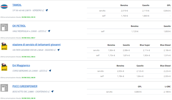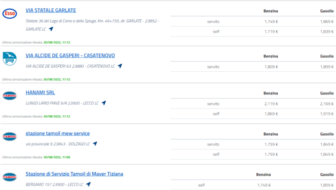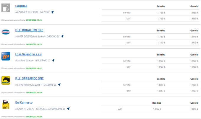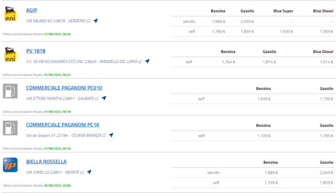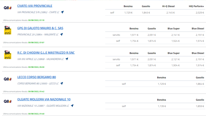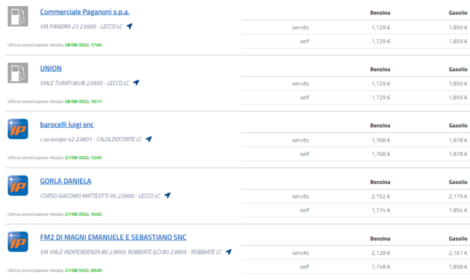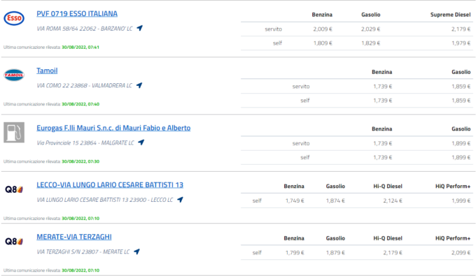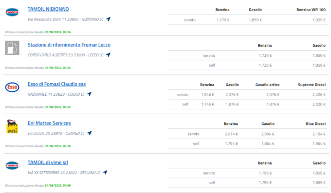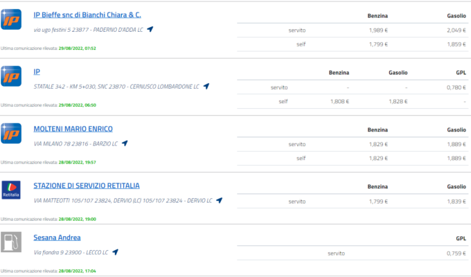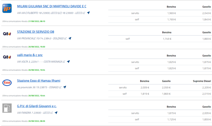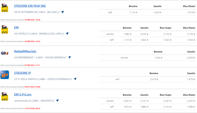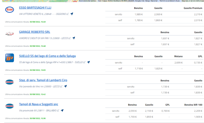 E a Lecco? A distanza di circa un mense dall’ultima  analisi vi riproponiamo la rilevazione della situazione  nella nostra provincia (qui i dati al 25 luglio 2022). I prezzi che vi proponiamo sono ordinati secondo l’ultimo aggiornamento a partire proprio da oggilunedì 25 luglio  2022.