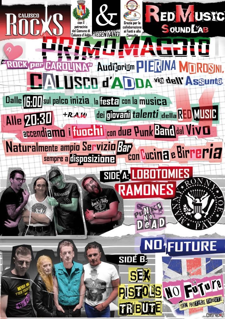 Calusco Rocks e Red Music Sound Lab, con il patrocinio del Comune di Calusco d’Adda e in collaborazione con No Future Italian Sex Pistols Tribute e Lobotomies Ramones Tribute, organizzano il Primo Maggio Rock per Carolina.