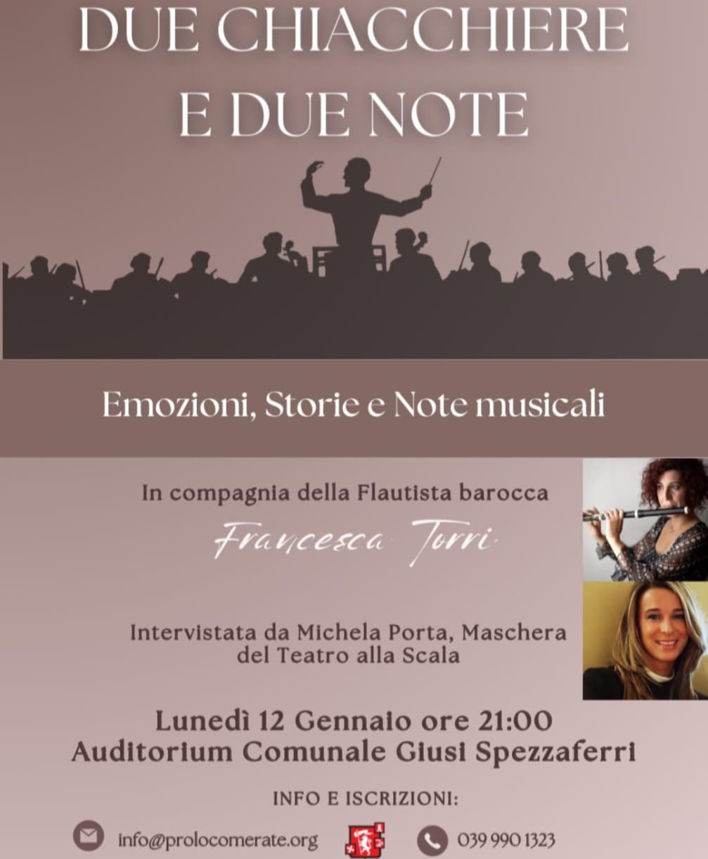 Lunedì 12 gennaio, alle 21, l’auditorium comunale «Giusi Spezzaferri» ospiterà l’incontro con Francesca Torri, flautista barocca. A dialogare con l’artista sarà Michela Porta, maschera del Teatro alla Scala, che accompagnerà il pubblico nel racconto del percorso musicale e professionale dell’ospite. L’ingresso è libero (Per informazioni e iscrizioni è possibile scrivere a info@prolocomerate.org oppure contattare il numero 039.9901323).