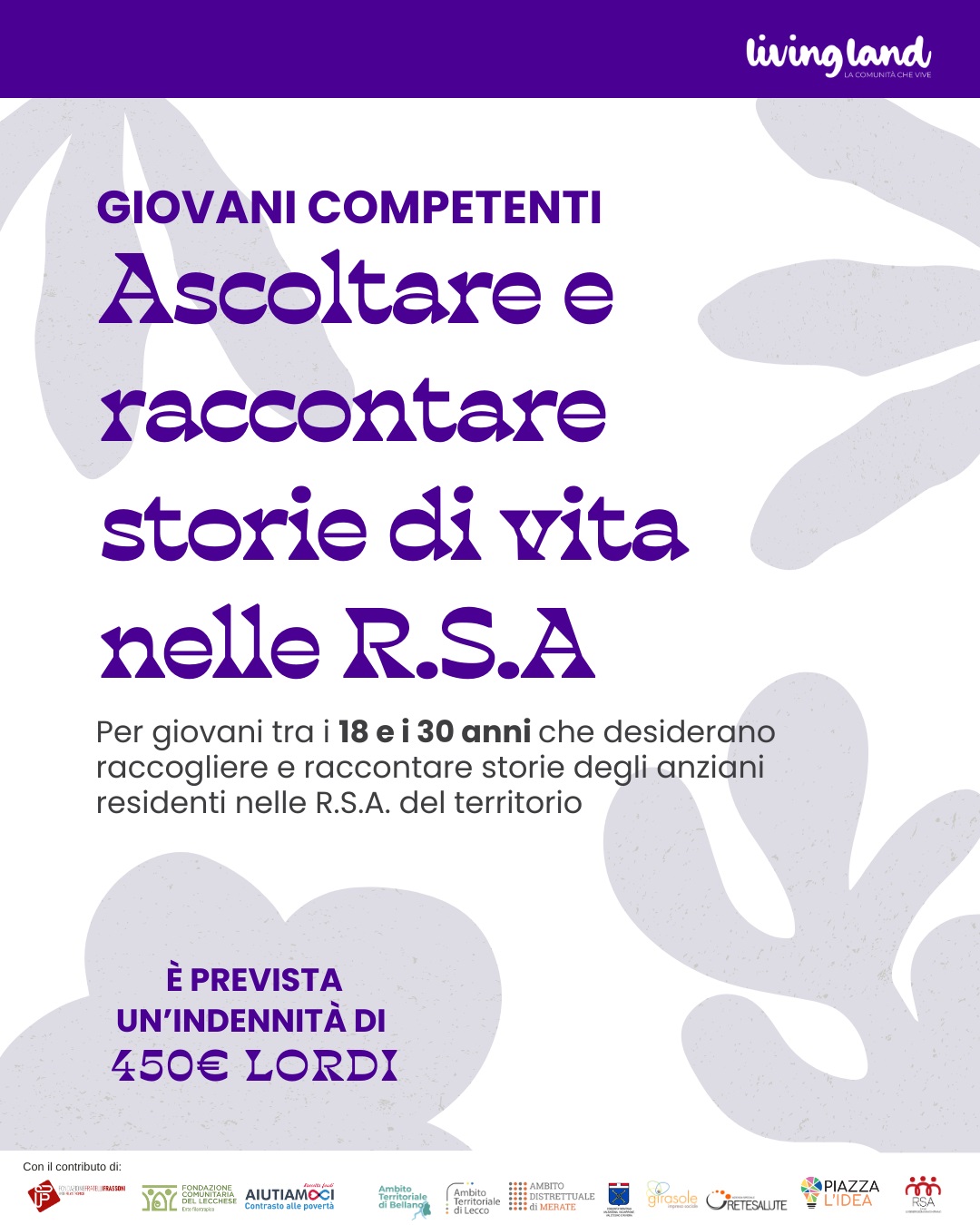 È questo l’obiettivo del bando lanciato dal progetto Living Land, che invita i giovani tra i 18 e i 30 anni a raccogliere le storie degli anziani residenti nelle Rsa del territorio.