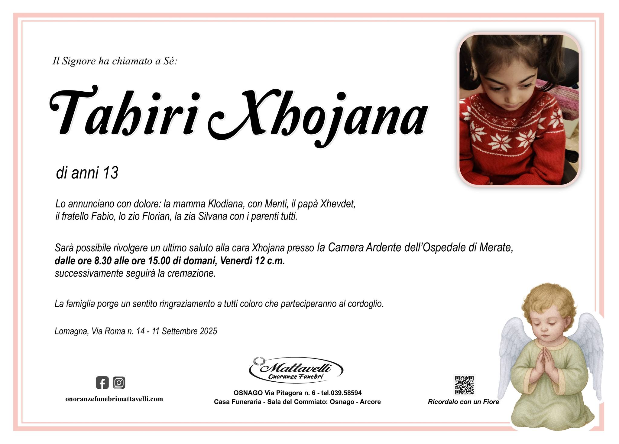 Ragazzina muore a soli 13 anni, un paese intero colpito dal dolore. E’ grande la commozione a Lomagna per la scomparsa della piccola Xhojana Tahiri, deceduta all’ospedale di Merate ieri, giovedì 11 settembre 2025.
