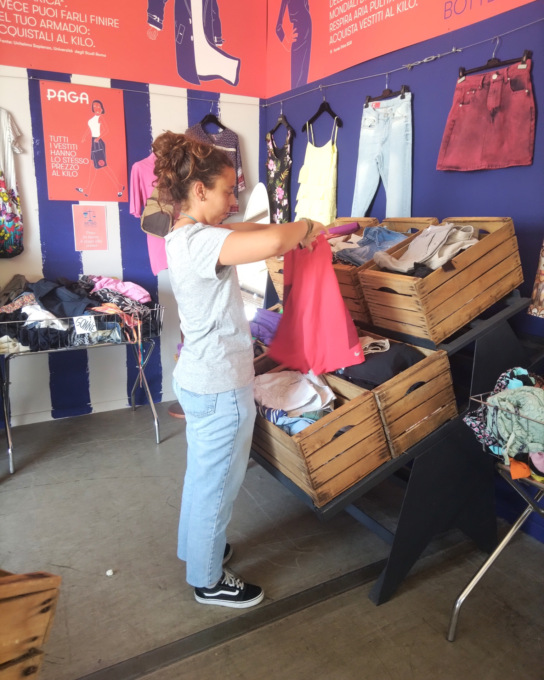 La Retrò Bottega è un’isola felice per tutti quelli che amano l’abbigliamento second-hand, uno spazio dove il cliente può muoversi liberamente in un percorso dove “frugare” è d’obbligo. Sì perché la selezione comprende ogni giorno 5 quintali di capi di vestiario selezionati e sanificati, pronti per essere scelti, pesati e comprati. Il costo? 9,50 euro al chilo, per un minimo di un chilo di spesa.