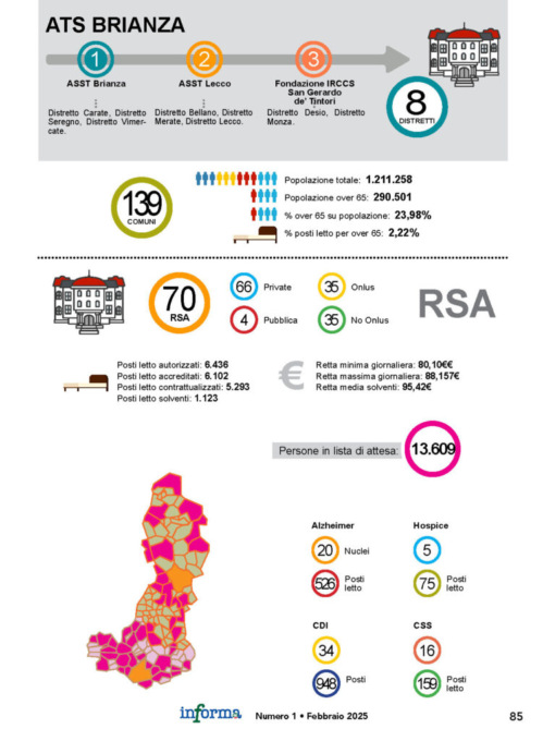 Nel territorio dell’ATS Brianza sono attive 70 Rsa di cui 66 private (il 94%) e 4 pubbliche (il 6%) gestite al 50% da società Onlus e al 50% non Onlus.