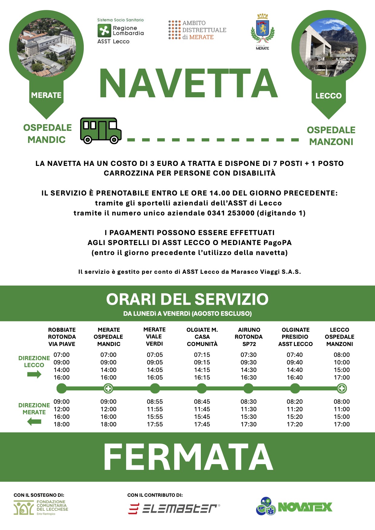 La sperimentazione, resa possibile grazie al sostegno della Fondazione Comunitaria del Lecchese e al contributo di Elemaster e Novatex, sarà attiva dal lunedì al venerdì e prevede collegamenti tra i due presidi in orari pensati per coincidere con le fasce più richieste per visite ed esami.