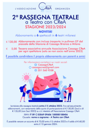 Per info: e-mail cassagocrea@gmail.com oppure tel./whatsapp al n. 351 560 9208. E’ possibile abbonarsi alla rassegna teatrale entro il 5 ottobre 2023 versando la quota di partecipazione di 130 euro sul c/c intestato all’Associazione Cassago CReA.