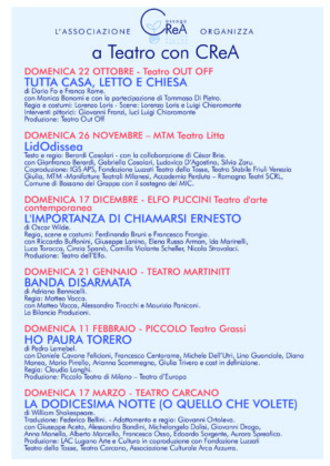 La proposta teatrale della stagione 2023-2024 avrà inizio il mese di ottobre e proseguirà con cadenza mensile fino a marzo; sono previsti 6 spettacoli in scena in 6 tra i migliori teatri di Milano