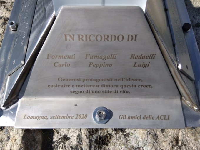 L’iniziativa si era poi concretizzata con la realizzazione, da parte di Carlo Formenti che di professione era fabbro, di una croce in acciaio inossidabile, alta 2.70 metri e larga 1.55 metri, per il peso di circa un quintale compreso il basamento con incisi i nomi dei due giovani e la scritta «Parrocchia di Lomagna, anno santo 1983/1984». La croce, divisa in tre pezzi, venne trasportata utilizzando un carrello della teleferica, messo a disposizione dall’Enel di Formazza, e poi «portata a spalla per circa due ore da un gruppo entusiasta di nove persone, composto da Massimo Brivio, Giancarlo e Carlo Formenti, la figlia di quest’ultimo Simona, Silvana Pirovano, Loris Sguazzin, Felice Sala e lo stesso Fumagalli e l’amico Luigi Redaelli».