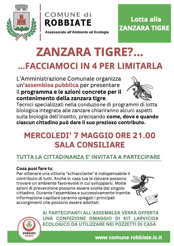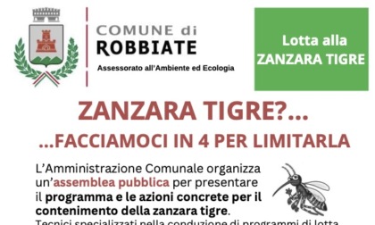 L’Amministrazione comunale di Robbiate organizza nella Sala Consiliare un’assemblea pubblica sul tema “Zanzara tigre? … Facciamoci in quattro per limitarla” per presentare alla cittadinanza il programma e le azioni concrete per il contenimento della zanzara tigre, previste per il 2025. L’appuntamento è per mercoledì 7 maggio 2025 alle 21.