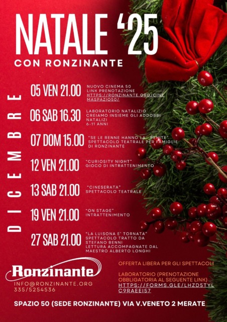 L’iscrizione è obbligatoria solo per il laboratorio natalizio e può essere effettuata scrivendo a info@ronzinante.org, chiamando il 3355254536 entro mercoledì 3 dicembre o tramite questo link: https://docs.google.com/forms/d/e/1FAIpQLSdSXEzZMWmD-s0296SOqLg5NID0ZheMyUlOm6y357mXbuZZKA/viewform