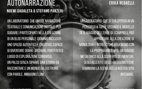 Il primo è intitolato blogging e auto-narrazione ed è a cura di Noemi Gadaleta e Stefano Panzeri. Qui narrazione teatrale e comunicazione digitale si uniscono per guidare i partecipanti nella creazione di un blog personale, che rappresenti uno spazio autentico e creativo, capace di diventare diario, archivio, portfolio, arricchito da parole, immagini e link.