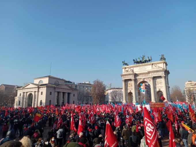 I manifestanti, giunti a Milano da tutte le regioni del Nord Italia, sventolano le bandiere dei sindacati e raggiungeranno l’Arco della Pace dove si sono tenuti i vari interventi dei delegati con anche collegamenti in diretta dalla piazza di Roma per le parole dei segretari nazionali di CGIL e UIL, Maurizio Landini e Pierpaolo Bombardieri.