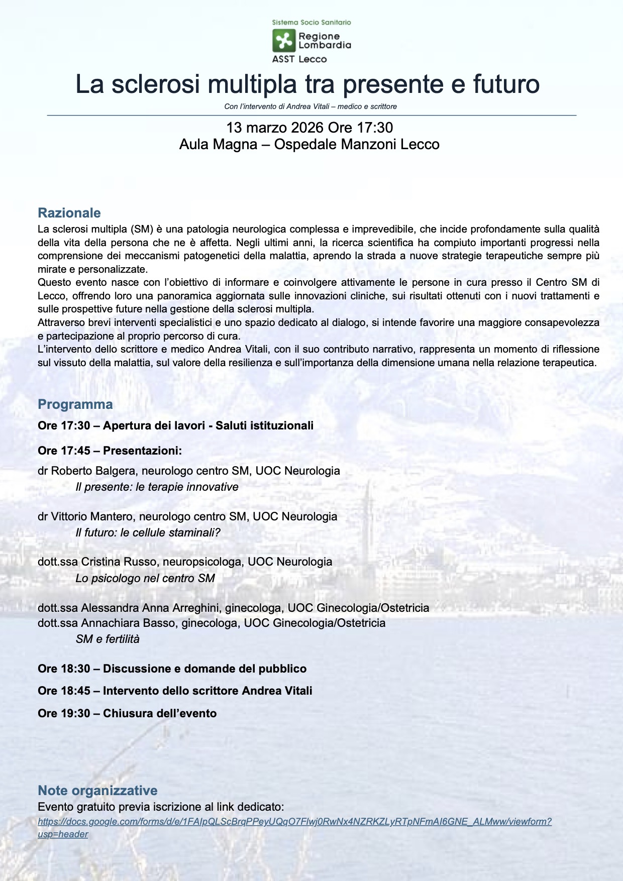 A completare il programma, l’intervento dello scrittore e medico bellanese Andrea Vitali, che offrirà un contributo narrativo di forte impatto, dedicato al vissuto della malattia, al valore della resilienza e al ruolo imprescindibile della dimensione umana nella relazione terapeutica.