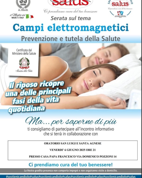 L’incontro è in programma per venerdì 6 giugno alle 21 nella Casa Papa Francesco di via Domenica Pozzoni 14 e il tema sarà «Campi elettromagnetici – Prevenzione e tutela della salute. Il riposo ricopre una delle fasi principali della vita quotidiana», con la certificazione del Ministero della Salute.