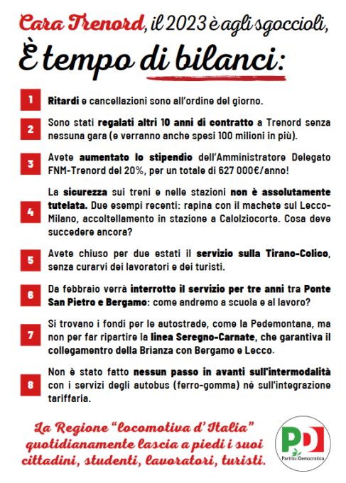“Cara Trenord, il 2023 è agli sgoccioli, è tempo di bilanci”. Inizia così il volantino di denuncia che le federazioni del Partito Democratico di Bergamo, Lecco, Monza Brianza e Sondrio distribuiranno nelle stazioni delle quattro province da lunedì 11 a domenica 17 dicembre. Un’intera settimana di mobilitazione per essere al fianco dei pendolari, studenti e lavoratori, che quotidianamente subiscono ritardi e soppressioni da parte del gestore del servizio ferroviario lombardo, Trenord, e per denunciarne il suo peggioramento ormai quotidiano.