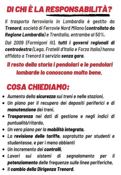Non possiamo più accettare che quella che si vanta di essere la “regione locomotiva d’Italia” lasci ogni giorno studenti, lavoratori e turisti a piedi. Regione Lombardia non può più nascondersi, si assuma le sue responsabilità ed inizi ad intervenire seriamente per garantire un servizio pubblico degno di questo nome”.