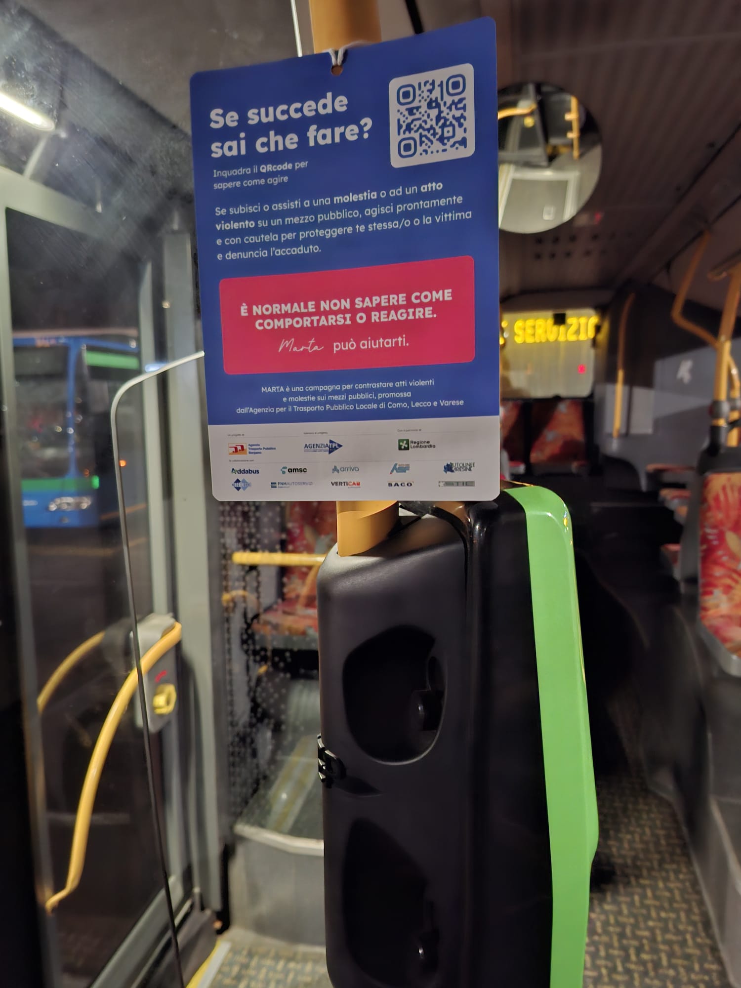 In occasione della Giornata Internazionale contro la Violenza sulle Donne, l’Agenzia per il Trasporto Pubblico Locale (TPL) del bacino di Como, Lecco e Varese, insieme all’Agenzia TPL di Bergamo, lancia la campagna di sensibilizzazione “Marta” per promuovere la sicurezza sui mezzi pubblici. L’iniziativa, già attiva nel bergamasco, arriva oggi nel territorio comasco, lecchese e varesino, con l’obiettivo di informare i cittadini su come comportarsi di fronte a situazioni di pericolo o molestie durante il viaggio.