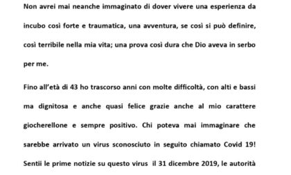 «Sono nato per la prima volta a Merate il 17 ottobre 1977. E la seconda volta il 3 aprile 2020 a Bergamo». Inizia così il racconto di Giuseppe Buscemi, cresciuto e residente alla Colombina a Casatenovo fino a qualche anno fa, prima di trasferirsi a Brembilla, in Val Brembana, per permettere alla moglie di avvicinarsi al luogo di lavoro. In una lunga lettera inviata alla nostra redazione ha voluto ripercorrere gli ultimi mesi della sua vita, con la consapevolezza di essere un miracolato.