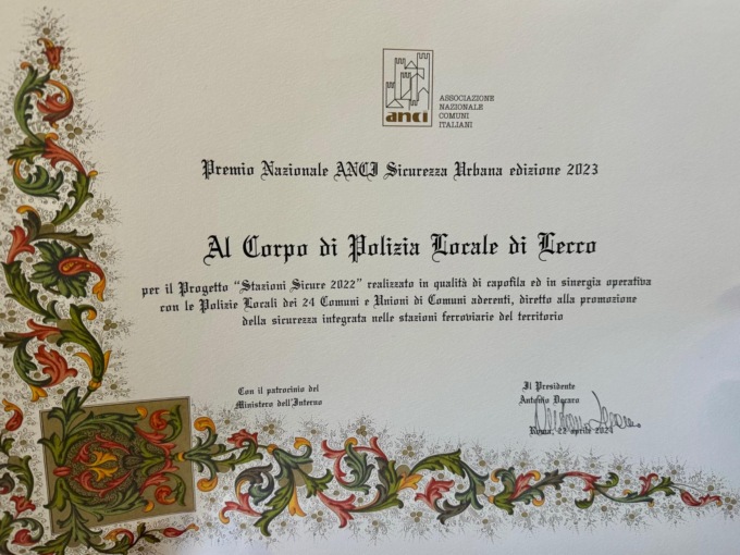 Stazioni sicure, Lecco si aggiudica il premio Anci Sicurezza Urbana 2023. Il premio, patrocinato dal Ministero dell’interno, è un riconoscimento dedicato al personale della polizia locale che si è particolarmente distinto in attività di servizio nel periodo compreso tra il 1° gennaio 2022 e il 31 dicembre 2022. Suddiviso in due sezioni, la sezione “migliore operazione/intervento” e la sezione “miglior progetto”, il premio è stato conferito questa mattina lunedì 22 aprile 2024 alle 10:30 a Roma, presso la sala conferenze di Anci nazionale, nell’ambito della presentazione del Rapporto nazionale sull’attività delle polizie locali alla presenza, fra gli altri, del direttore dell’Ufficio per il coordinamento e la pianificazione delle Forze di Polizia presso il Dipartimento di pubblica sicurezza, del segretario generale Anci e del vicepresidente Anci delegato a sicurezza e legalità, oltre che dagli amministratori locali di numerosi capoluoghi italiani.