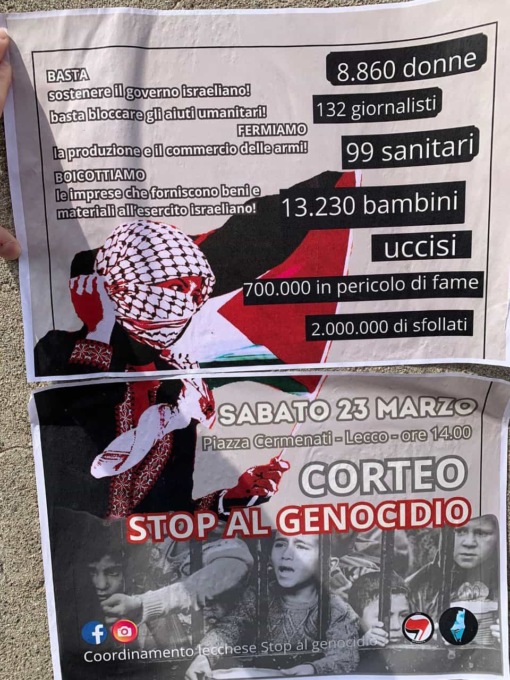 Stop al genocidio in Palestina, boicottiamo le imprese lecchesi che forniscono armi e munizioni all’esercito israeliano. Questi, in sintesi, i messaggi che ha voluto lanciare nel pomeriggio di oggi, sabato 23 marzo 2024, il coordinamento lecchese “Stop al genocidio”.
