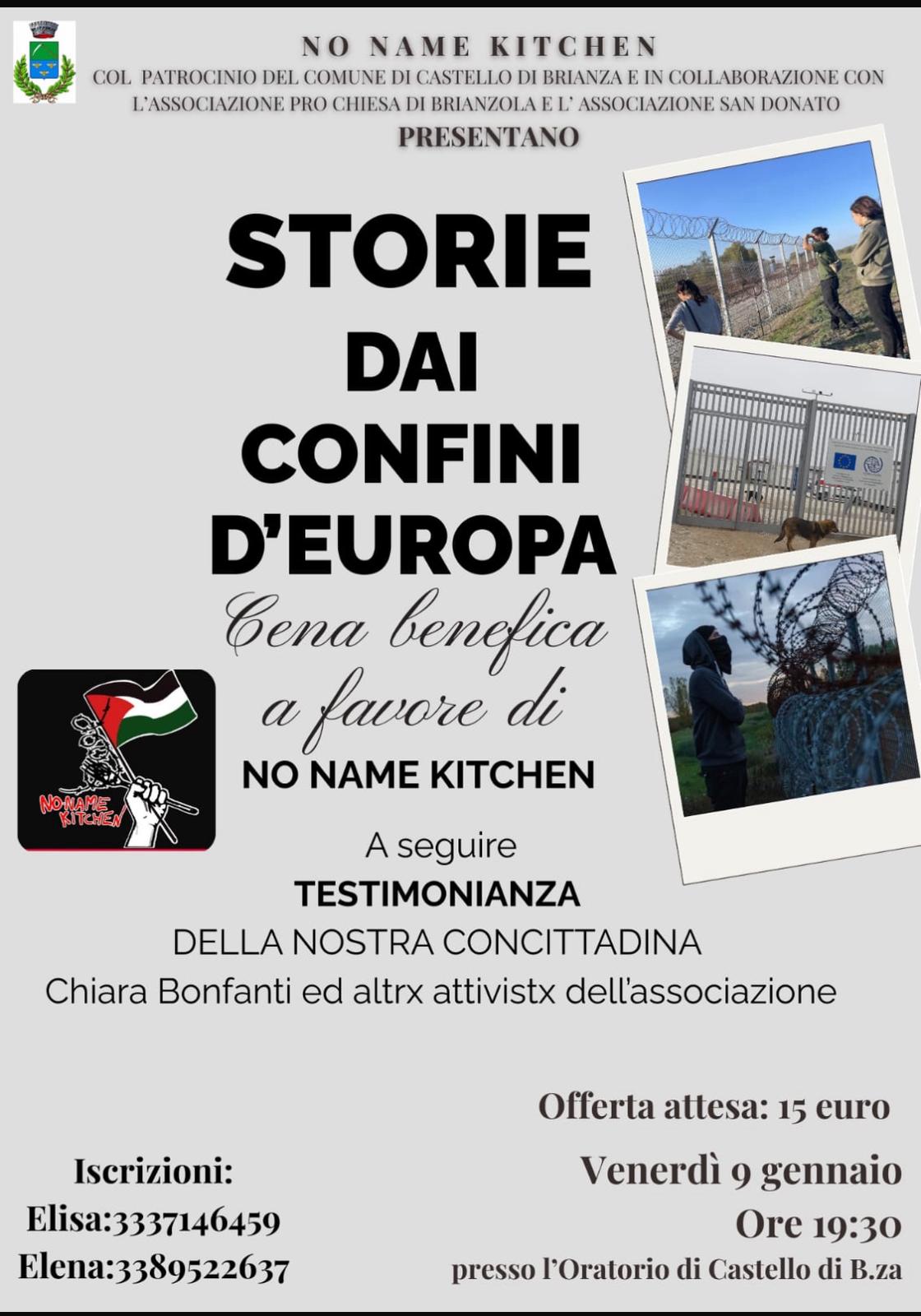 “Storie dai confini d’Europa”: una cena benefica a favore di No Name Kitchen. Una serata di racconto, riflessione e solidarietà per accendere i riflettori su uno dei temi più complessi e drammatici dell’attualità europea. Venerdì 9 gennaio, a partire dalle ore 19.30, presso l’Oratorio di Castello di Brianza, è in programma l’iniziativa “Storie dai confini d’Europa”, una cena benefica a favore di No Name Kitchen, associazione impegnata nel sostegno alle persone migranti lungo le rotte di frontiera del continente.