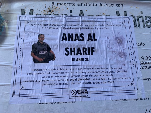 In alcuni casi ad accompagnare l’epigrafe anche un manifesto, sempre con il logo di “Extinction rebellion”, che inneggia all’operazione in corso della “Global sumud flotilla”, un’iniziativa marittima internazionale in corso in questi giorni, guidata dalla società civile, lanciata con l’obiettivo di rompere il blocco israeliano sulla Striscia di Gaza.