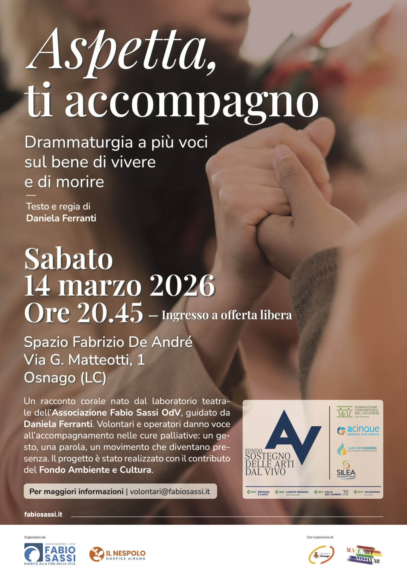 Torna in scena a Osnago lo spettacolo “Aspetta, ti accompagno”. Dopo il debutto dello scorso dicembre, l’Associazione Fabio Sassi OdV ripropone “Aspetta, ti accompagno”, lo spettacolo teatrale nato dall’esperienza della cura e dalla forza dell’ascolto. La replica, patrocinata dal Comune di Osnago, è in programma sabato 14 marzo 2026, alle ore 20.45, presso Spazio Fabrizio De André (Via G. Matteotti 1, Osnago).ù