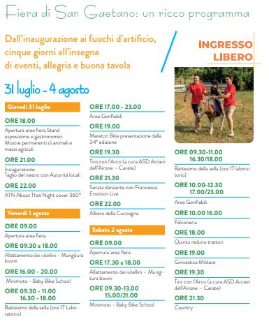 Venerdì, sabato, domenica e lunedì la fiera aprirà alle 9 di mattina: confermatissimi gli appuntamenti con l’allattamento dei vitellini e la mungitura dei bovini, tutte le sere ci saranno musica e balli e venerdì alle 22 occhi rivolti al cielo con le sfide all’albero della cuccagna.