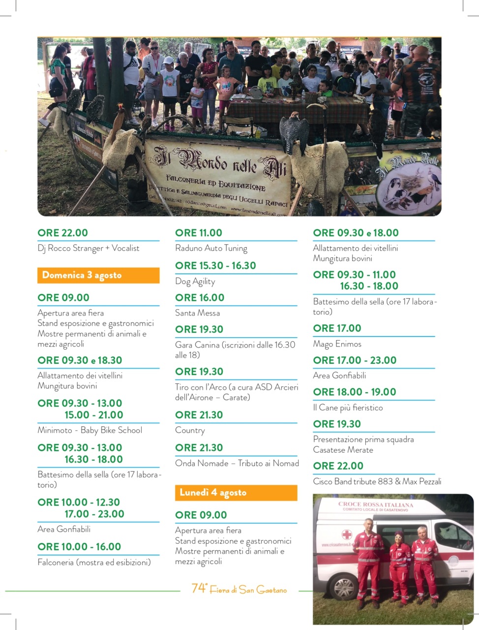 La giornata più ricca di eventi è, come sempre, quella di domenica 3 agosto: dal mattino, a seguire, minimoto, battesimo della sella, mostra ed esibizioni di falconeria, raduno di auto tuning, agility dog, Messa, gara canina e tiro con l’arco. Lunedì gran chiusura, nel tardo pomeriggio, con lo spettacolo di magia, il premio al «cane più fieristico», la presentazione della prima squadra della Casatese Merate e il tributo agli 883. Tutto il programma si può trovare nel magazine allegato a questo numero del Giornale di Merate, che sarà disponibile anche in Fiera.